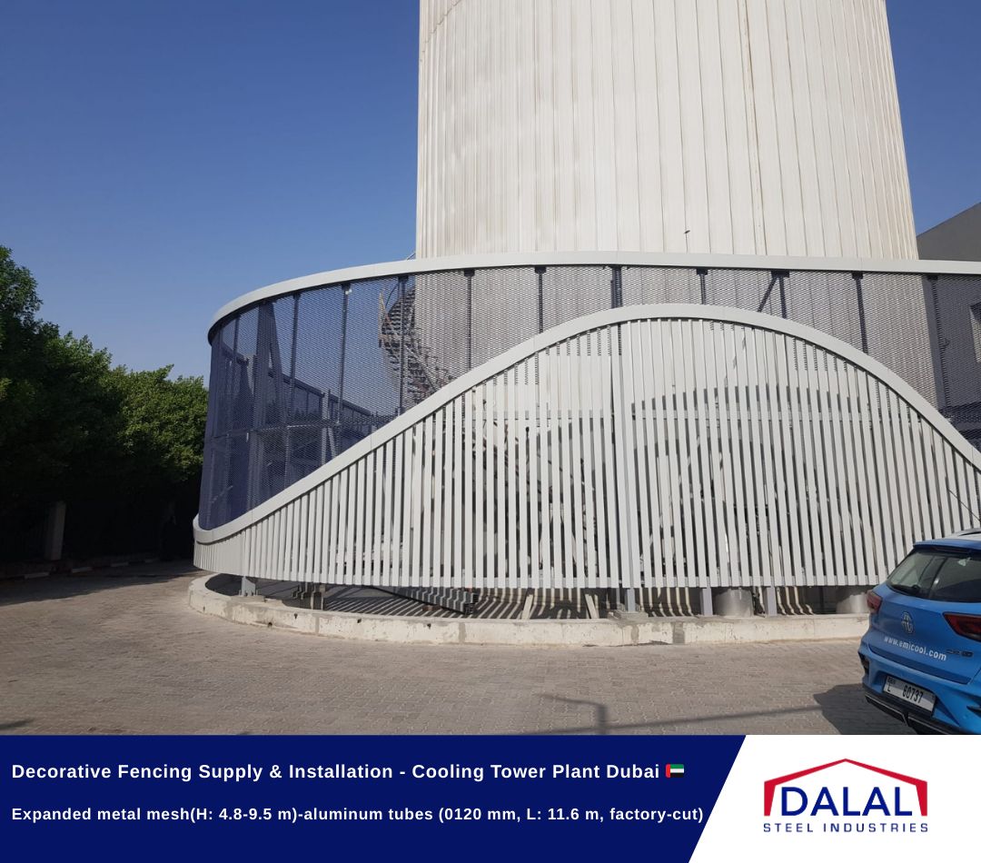 Architectural Fence System for a Cooling Tower in Dubai, UAE, using aluminum tubes and expanded aluminum mesh.